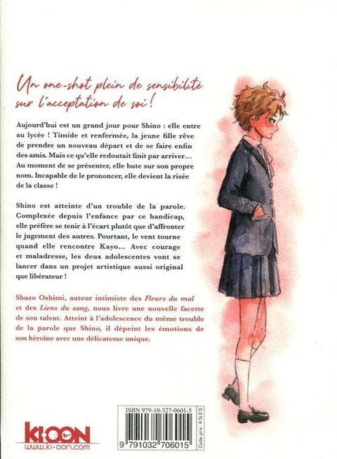 Le mangaka, Shuzo Oshimi, est avant tout connu pour des mangas très durs voire malaisants. Mais cette œuvre nous montre une toute autre facette de l’auteur. Destinée à un large public, ce one shot traite d’un sujet très intéressant et rarement abordé : le trouble de la parole. Lui-même atteint (...) Voir le commentaire