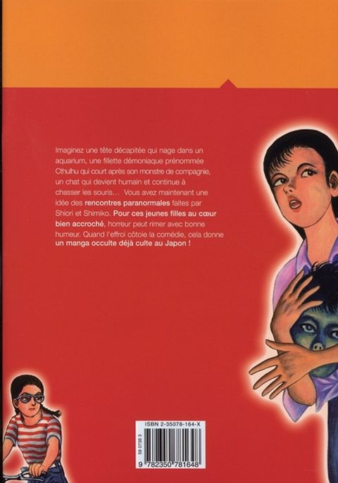 Imaginez une tête décapitée qui nage dans un aquarium, une fillette démoniaque prénommée Cthulhu qui court après un monstre de compagnie, un chat qui devient humain et continue à chasser les souris. Vous avez maintenant une idée des rencontres paranormales faites par Shiori et Shimiko. Pour ces jeunes filles au coeur bien accroché, horreur peut rimer avec bonne humeur. Quand l'effroi côtoie la comédie, cela donne un manga déjà culte au japon !.