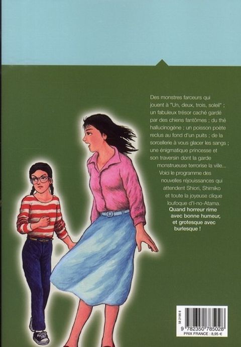 Des monstres farceurs qui jouent à ""un, deux, trois, soleil"" un fabuleux trésor caché gardé par des chiens fantômes ; du thé hallucinogène ; un poisson poète reclus au fond d'un puits ; de la sorcellerie à vous glacer les sangs ; une énigmatique princesse et son traversin dont la garde monstrueuse terrorise la ville... Voici le programme des nouvelles réjouissances qui attendent shiori, shimiko et toute la joyeuse clique loufoque d'i-no-atama. quand horreur rime avec bonne humeur, et grotesque avec burlesque !
