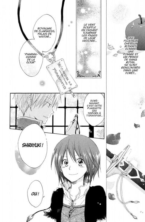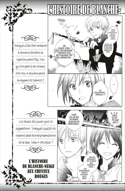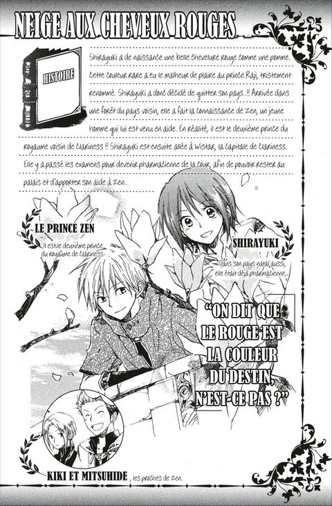 Shirayuki, avec ses cheveux rouges, attire le regard du Prince Raji qui veut en faire sa concubine. La jeune fille ne se laisse pas faire et s'enfuit du royaume. En chemin, elle rencontre Zen avec qui elle se lie d'amitié. Le garçon la protégera et se révélera être le prince du royaume voisin. Comment l'étrange amitié qui lie ces deux êtres va-t-elle évoluer ?