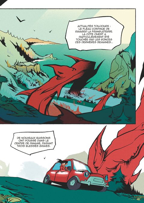 Qui s’y frotte s’y piqueDepuis la mort de sa mère, la vie de Sid a basculé. Quand il débarque à Berry Hill, une étrange école nichée dans un vieux château sur la côte, tout semble contre lui : l’année a déjà commencé, les douches sont glacées et… ah oui, des ronces géantes envahissent les salles ! Voilà 50 ans que ces plantes monstrueuses , connues sous le nom du Fléau, ravagent la Frangleterre, défigurant le pays. Malgré ce décor hostile et le poids du deuil, Sid se reconstruira peu à peu au contact de ses nouveaux camarades. Malcolm, le musicien au bras mécanique; Lula, la commère intarissable fan de poésie; et Kate, une fille punk et bagarreuse qui ne mâche pas ses mots. Au même moment, Julian Strokes, un présentateur TV has been tentera de sauver sa carrière. Sa mission ? Découvrir les origines du Fléau ! Ses investigations le mèneront tout droit à Berry Hill... Et si le château avait un lien étroit avec l’origine de ces ronces ? Entre mystères à élucider, concerts sauvages et courses-poursuites entre les épines, Sid et ses amis devront faire preuve de courage pour sauver leur école… et leurs vies !Pendragon nous offre un premier diptyque fantastique au cœur des ronces enchevêtrées, qui mêle influences shonen, musique et pop culture. Avec une galerie de personnages attachants et cabossés, il explore des thématiques fortes où la crise écologique côtoie la puissance des amitiés de jeunesse.
