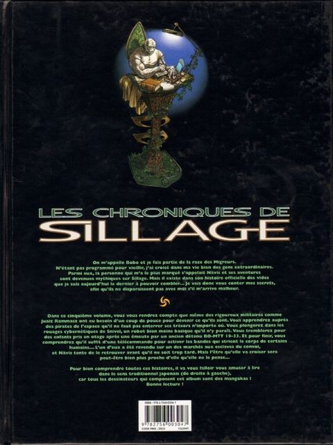 À découvrir dans ce cinquième volume : la création du robot Snivel, la jeunesse du général Juaiz, un affrontement musclé avec un truand échappé de la prisonef du tome 7, des retrouvailles entre Nävis et les pirates qui avaient sabordé son anniversaire (Les Chroniques de Sillage 1), et une surprise de taille... Nävis n'est plus la seule représentante de la race humaine sur le convoi interstellaire Sillage ! Comprend 5 histoires courtes de 8 planches chacune aux Scénarii de Philippe Buchet et Jean David Morvan: "Au bord des armes" Naoki (dessins et couleurs) "Droits de reproduction" Wataru, Uekusa (dessins et couleurs) "Les crocs sous la muselière" Hikaru, Takahashi (dessins et couleurs) "Le vaisseau-gîte au trésor" Hiroyuki, Ooshima (dessins et couleurs) "Bandes blanches et homme en noir" Kazutaka (dessins et couleurs) Illustrations des chapitres par Riki