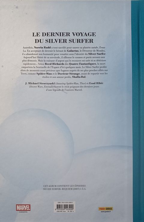 Au fil des années, Norrin Radd a parcouru la galaxie, témoin de la naissance et de la disparition de nombreuses civilisations. Mais aujourd'hui, son odyssée touche à sa fin. Il est temps pour lui d'entreprendre son ultime voyage, et de retourner là où tout a commencé... Assistez aux derniers jours du Silver Surfer dans cette mini-série complète écrite par J. Michael Straczynski et superbement illustrée par Esad Ribic (Thor : God of Thunder).