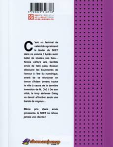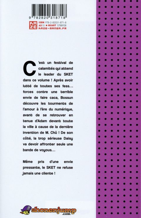C'est un festival de calamités qui attend le leader du SKET dans ce volume ! Après avoir lutté de toutes ses fess...forces contre une terrible envie de faire caca, Bossun découvre les tourments de l'amour à l'ère du numérique, avant de se retrouver en tenue d'Adam devant toute la ville à cause de la dernière trouvaille de M. Chû ! De son côté, la trop sérieuse Daisy se retrouve à devoir affronter seule une bande de voyous... Même pris d'une envie pressante, le SKET ne refuse jamais une cliente !