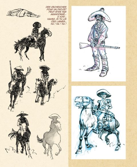 Ce nouveau sketchbook fourmille de pépites et fait la part belle aux thèmes chers à son auteur tels que le western-spaghetti ou les pirates. Il regorge en outre d’hommages aux artistes que Pierre Alary admire, de projets qui n’ont pas encore vus le jour, d’essais de couvertures, de recherches diverses, d’extraits de story-board, d’ex-libris, etc. Pour ce 2ème sketchbook, Alary privilégie l’illustration et la couleur. Vous pourrez notamment découvrir les diverses propositions de maquettes, en couleur, réalisées pour les couvertures de ses albums.