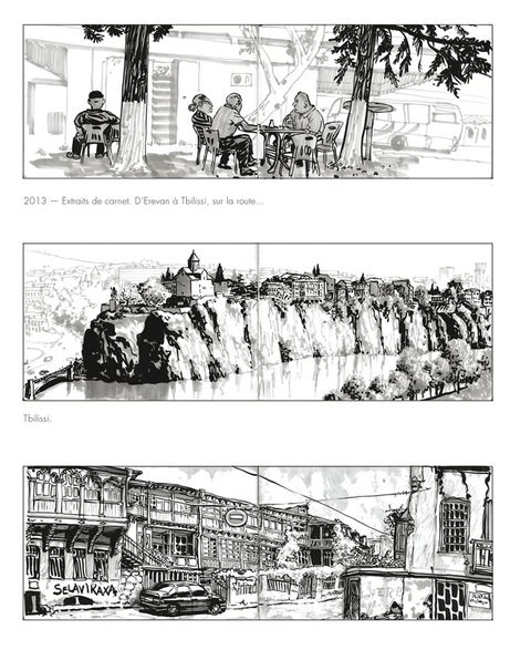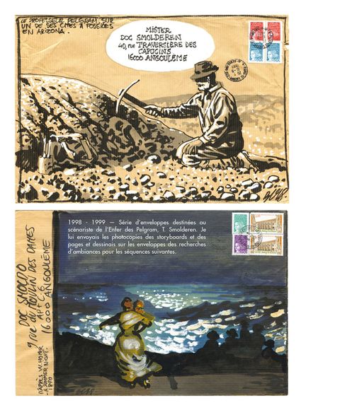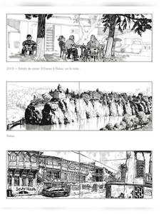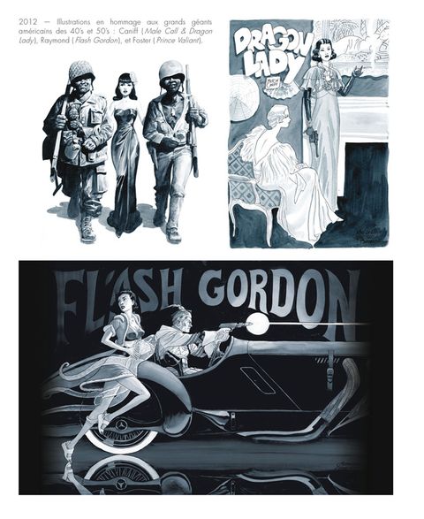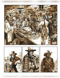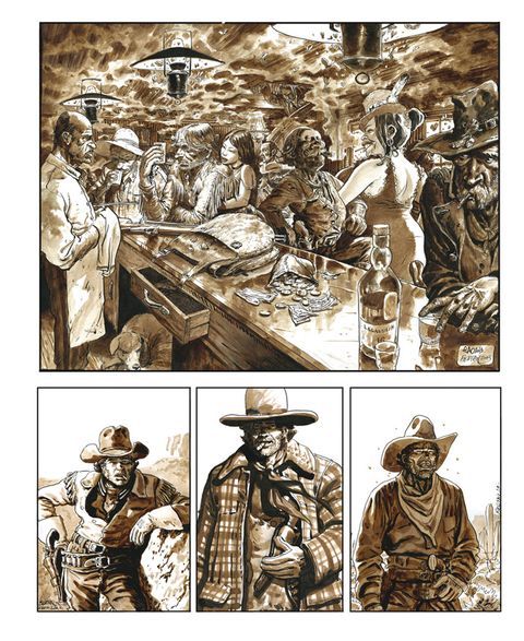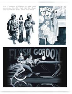Entrez dans l’univers déroutant de Dominique Bertail, le dessinateur de la série Ghost Money, scénarisée par Thierry Smolderen. Très belle entrée en matière avec une petite histoire de la mode. On découvre l’auteur en véritable styliste ! Vêtements d’époque, costumes, uniformes pour Shandy, un vrai régal pour les yeux où l’élégance est de loin le maître mot ! Puis Bertail nous ouvre les portes de son univers éclectique : paysages, cow-boys, portraits de ses contemporains et de ses confrères auteurs de BD, dédicaces sur Shandy, hommages à Blueberry, Thorgal, Male Call ou Prince Valiant… Vous l’aurez compris, ce sketchbook fourmille de croquis en tout genre! Son dessin est précis, son trait nerveux et puissant, on passe d’une technique à une autre (pastels gras, aquarelles, crayonnés, peintures numériques), d’un univers à un autre, du majestueux à l’incroyablement oppressant. La recherche d’ambiance est omniprésente, les atmosphères aux feutres gris renversantes, le travail sur la lumière époustouflant ! On est émus, touchés par la sensibilité de cet artiste aux multiples talents !