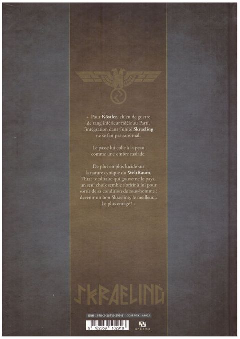 Pour Köstler, étranger originaire des territoires de l’est annexés devenu chien de guerre fidèle au Parti, l’intégration dans l’unité d’élite Skraeling ne se fait pas sans mal. Le passé lui colle à la peau comme une ombre malade. De plus en plus lucide sur la nature cynique du WeltRaum, l’État totalitaire qui gouverne le pays, un seul choix semble s’offrir à lui pour sortir de sa condition de sous-homme : devenir un bon Skraeling, le meilleur... Le plus enragé !