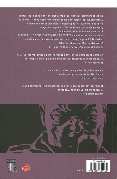 Toutes les pièces sont en place, mais qui est aux commandes de ce jeu mortel ? Tous semblent croire qu'ils contrôlent les événements... Comment est-ce possible ? Holden peut-il survivre à la lutte sanglante opposant Tao et Lynch, ou craquera-t-il, emportant tout le monde avec lui ? Sleeper : le long chemin de la liberté recueille les six derniers chapitres de la saga saluée par la critique, signée Ed Brubaker (Captain America, Secret Avengers) et Sean Phillips (Marvel Zombies, Criminel).