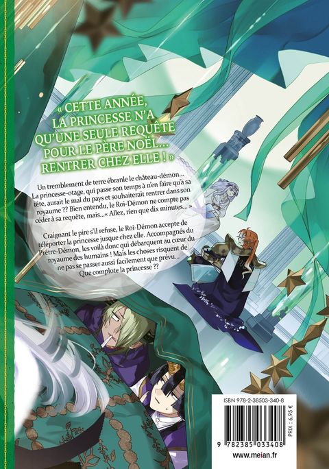 " Cette année, la princesse n'a qu'une seule requête pour le Père Noël... Rentrer chez elle ! "Un tremblement de terre ébranle le château-démon... La princesse-otage, qui passe son temps à n'en faire qu'à sa tête, aurait le mal du pays et souhaiterait rentrer dans son royaume ?? Bien entendu, le Roi-Démon ne compte pas céder à sa requête, mais..." Allez, rien que dix minutes... "Craignant le pire s'il refuse, le Roi-Démon accepte de téléporter la princesse jusque chez elle. Accompagnés du Prêtre-Démon, les voilà donc qui débarquent au coeur du royaume des humains ! Mais les choses risquent de ne pas se passer aussi facilement que prévu... Que complote la princesse ??Un nouveau tome particulièrement décoiffant !