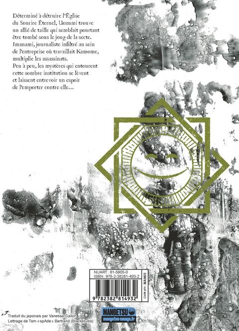 Déterminé à détruire l'Église du Sourire Éternel, Uozumi trouve un allié de taille qui semblait pourtant être tombé sous le joug de la secte.Imanami, journaliste infiltré au sein de l'entreprise où travaillait Kamome, multiplie les assassinats.Peu à peu, les mystères qui entourent cette sombre institution se lèvent et laissent entrevoir un espoir de l'emporter contre elle...Publiée chez Nihon Bungeisha, Smile! est une oeuvre qui plonge le lecteur dans les ténèbres d'un culte inquiétant. Hattori Mitei vous entraîne dans un thriller des plus haletants et un drame psychologique inoubliable. « Un thriller psychologique captivant. » Francetvinfo.fr« Un suspense totalement addictif. » Le Point Pop
