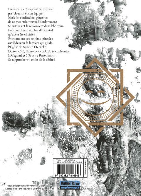 Imanami a été capturé de justesse par Uozumi et son équipe. Mais les confessions glaçantes de ce meurtrier torturé bouleversent Suzumura et la replongent dans l'horreur. Pourquoi Imanami lui affirme-t-il qu'elle a été choisie ? Et comment cet « enfant miracle » est-il devenu la lumière qui guide l'Église du Sourire Éternel ?De son côté, Kamome décide de se confronter à Megumi et à Sourire Rayonnant... Se rapproche-t-il enfin de la vérité ?Publiée chez Nihon Bungeisha, Smile! est une oeuvre qui plonge le lecteur dans les ténèbres d'un culte inquiétant. Hattori Mitei vous entraîne dans un thriller des plus haletants et un drame psychologique inoubliable.« Un thriller psychologique captivant. » Francetvinfo.fr« Un suspense totalement addictif. » Le Point Pop