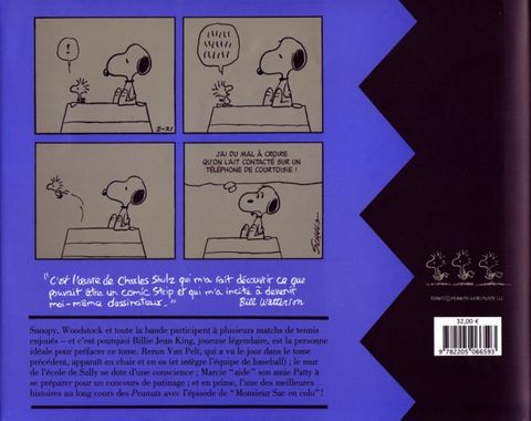 Snoopy, Woodstock et toute la clique s'adonnent à quelques matchs de tennis très animés. Et puis Rerun Van Pelt, né dans le tome précédent, fait son apparition en chair et en os, et est intégré dans l'équipe de base-ball ; l'école de Sally prend conscience de l'état de la fi llette ; Marcie « aide » son amie Patty Pastille-de-menthe à préparer une compétition de skate ; et on a aussi l'une des meilleures histoires des Peanuts : la séquence « Mister Sack Goes to Camp » de Charlie Brown !