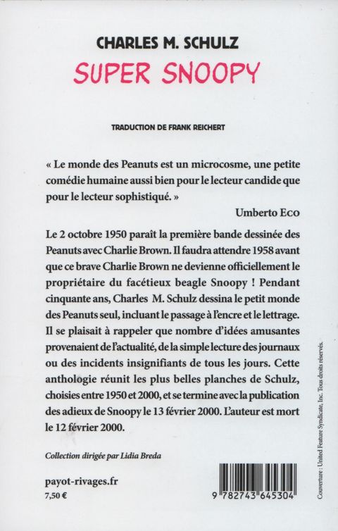 <div>le 2 Octobre 1950 Parait la Première Bande Dessinée des Peanuts avec Charlie Brown. il Faudra Attendre 1958 Avant que ce Brave Charlie Brown ne Devienne Officiellement le Propriétaire du Facétieux Beagle Snoopy ! </div><div>pendant Cinquante Ans, Charles M. Schulz Dessina le Petit Monde des Peanuts Seul, Incluant le Passage à l'Encre et le Lettrage. il se Plaisait à Rappeler que Nombre d'Idées Amusantes Provenaient de l'Actualité, de la Simple Lecture des Journaux ou des Incidents Insignifiants de Tous les Jours.</div>