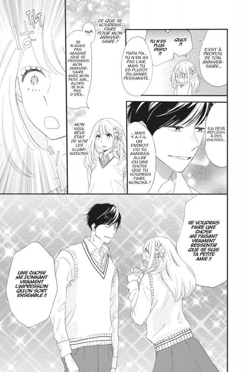 Depuis toute petite, Nonaka rêve d'avoir un amoureux. Arrivée au lycée, elle n'a toujours pas de petit copain. Elle décide d'enchaîner les soirées, commence un petit boulot, tente de rencontrer des garçons mais rien n'y fait. En réalité, elle a fait la connaissance de quelqu'un : il s'appelle Naoya et il devient son confident. Mais n'y-a-t ‘il vraiment que de l'amitié entre eux ? Il semblerait que Nonaka ne sache pas vraiment ce que c'est qu'être amoureuse. Elle va devoir partir à la conquête de ce sentiment avant de pouvoir franchir le pas.