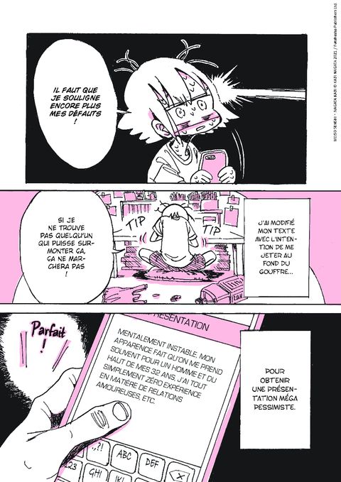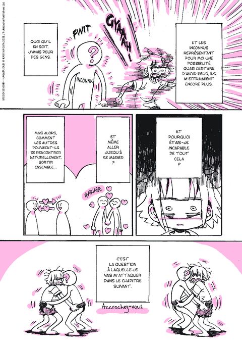 Parlons peu, parlons bien : moi, une dessinatrice mentalement instable dans la trentaine, qui n’a eu d’expérience sexuelle qu’avec une travailleuse du sexe, et n’a jamais eu de relation amoureuse, je vais ici vous parler de mes tribulations mentales tandis que je poursuis mon désir de me marier, d’aimer et être aimée ! Sacré programme !