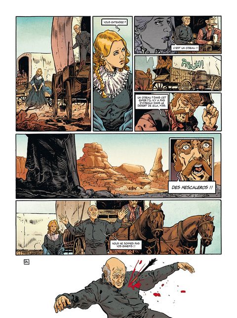 Une procession de chariots traverse le désert de Sonora en quête d'une terre fertile pour commencer une nouvelle vie. Une vie dignement gagnée avec pour seule richesse celle que feront sortir de la terre ces agriculteurs pionniers. Aux aguets, l'un d'entre eux entend un oiseau, mais, dans l'ouest américain qui porte des plumes n'est pas toujours un oiseau...