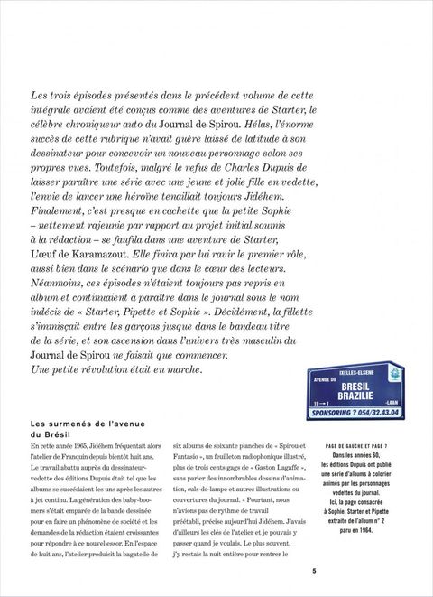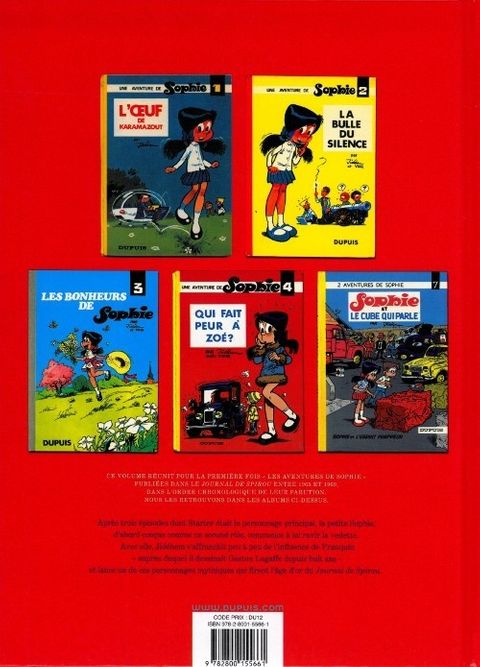 Après une première apparition dans les aventures de Starter, où elle occupait un second rôle, Sophie ne tarde pas à s'affirmer comme une héroïne à part entière, plébiscitée par les lecteurs du Journal de Spirou. Avec ses couettes et son look très sixties, Sophie est la fille d'un inventeur très en avance sur son temps. Imaginées par le scénariste Vicq, les aventures de la fillette charment les lecteurs par leur rythme, leur créativité et leur fantaisie débridée. Sous le pinceau de Jidéhem, Sophie entame une ascension totalement inédite pour une fi lle dans l'univers très masculin de Spirou, et de la bande dessinée de l'époque. Le présent volume réunit des histoires parues entre 1965 et 1972 dans les albums L’œuf de Karamazout, La Bulle du silence, Les Bonheurs de Sophie, Qui fait peur à Zoé et Sophie et le Cube qui parle, accompagnées d'un dossier de Christelle et Bertrand Pissavy- Yvernault.