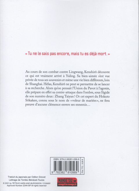Pan Guangling revient à la tête du Syndicat de Jade, bien décidé à reprendre en main la ville de Shanghai. Kenshirô, quant à lui, a vaincu Lingwang, le roi des spectres, où ce dernier lui a révélé que sa chère et tendre Yuling est toujours vivante, mais amnésique ! Le Roi des enfers part alors, avec Pan, combattre Zhang Taiyan, numéro deux de l'Union et disciple du Hokuto Sôkaken...Tetsuo Hara et Buronson reviennent plus de dix ans après la fin du cultissime <em>Hokuto No Ken</em>, vendu à plus de 100 millions d'exemplaires dans le monde, dans une préquelle centrée sur l'oncle de Kenshirô, Kenshirô Kasumi, 62e successeur de la légendaire technique du Hokuto Shinken.Cette réédition de <em>Soten No Ken</em>, vivement attendue par les lecteurs de la toute première série, est le deuxième titre d'une collection dédiée à Tetsuo Hara. Au plus proche de la version originale (sens de lecture japonais, onomatopées sous-titrées), elle bénéficie d'une nouvelle traduction, d'un nouveau lettrage et d'une fabrication soignée.
