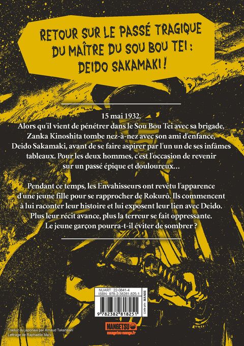 Retour sur le passé tragique du maître du Sou Bou Tei : Deido Sakamaki !15 mai 1932.Alors qu'il vient de pénétrer dans le Sou Bou Tei avec sa brigade, Zanka Kinoshita tombe nez-à-nez avec son ami d'enfance Deido Sakamaki et se fait aspirer dans un de ses tableaux infâmes...Pour les deux hommes, c'est l'occasion de revenir sur un passé épique et douloureux...Pendant ce temps, les « Envahisseurs » ont revêtu l'apparence d'une jeune fille pour se rapprocher de Rokurô. Ils commencent à lui raconter leur histoire et lui exposent leur lien avec Deido.Plus leur récit avance, plus la terreur se fait oppressante. Le jeune garçon pourra-t-il éviter de sombrer ?