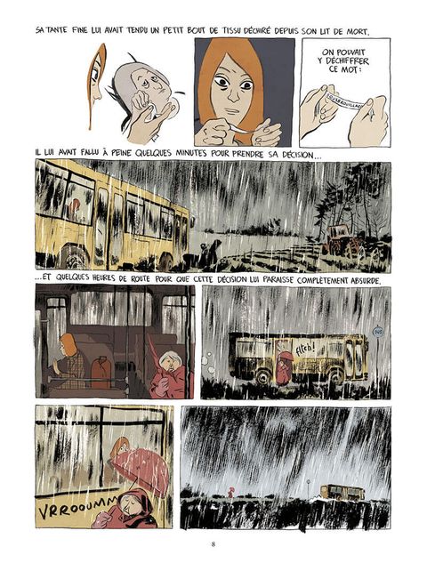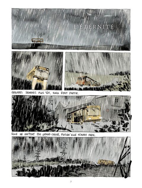 Sara ignore tout de ses origines. Elle n'a jamais connu sa famille. Sur son lit de mort, la vieille tante qui l'a élevée lui confie l'unique indice en sa possession : la moitié déchirée d'un bracelet de naissance. Un mot y est griffonné, c'est un nom de lieu : Sousbrouillard. Sara, en quête de son passé, laisse aussitôt derrière elle sa vie parisienne sans histoire. Elle se rend à Sousbrouillard, village un peu hors du temps, construit autour d'un lac sombre et mystérieux. Après une petite période d'adaptation dans ce « désert au milieu de nulle part », Sara va commencer à y faire des rencontres. Les habitants de Sousbrouillard lui racontent leurs propres parcours, « cabossés et rocambolesques », hauts en couleurs, tristes et émouvants. Sara les écoute avec tant d'empathie qu'elle finit par en oublier sa propre quête. C'est quand elle ne s'y attendra plus que lui sera révélé le noeud secret de toutes ces histoires et qu'elle comprendra d'où elle vient... Derrière son apparente réalité, Sousbrouillard glisse peu à peu vers le conte philosophique et la fable poétique. L'album met en lumière notre besoin de faire partie d'une histoire, ainsi que l'importance de ces rencontres qui changent parfois le cours d'une vie.