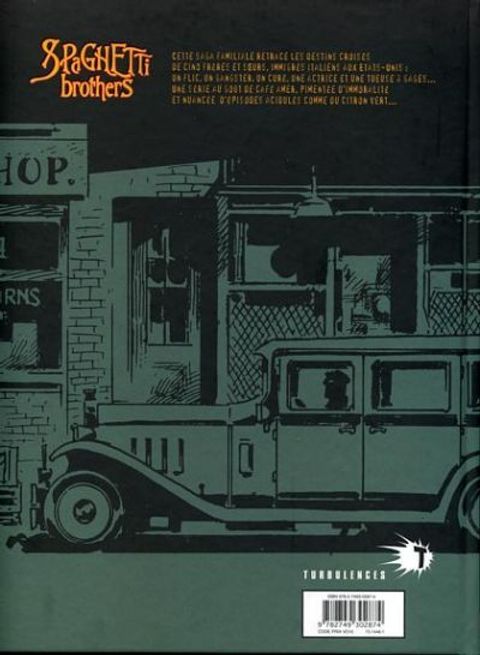 Une nouvelle marche vers la descente aux enfers de la famille CentobucchiDifficile pour le père Franck Centobucchi de trouver le temps de prier pour ses paroissiens. Et pourtant Dieu sait qu'ils ont besoin de lui, ces immigrés italiens piégés dans l'Amérique de la Grande Dépression ! Le problème, c'est que Franck a déjà fort à faire avec sa propre famille, composée d'un ponte de la Mafia, d'un flic, d'une actrice et d'une mère de famille arrondissant ses fins de mois en se faisant tueuse à gages... Autant de métiers qui donneront aux frères et soeurs de Franck l'occasion de salir leur âme, pour le salut de laquelle l'homme d'Église priera tant qu'il pourra... Chroniques de la Mafia de proximité et de son cortège de magouilles, de drames et de morts ordinaires, "Spaghetti Brothers "est une plongée sombre et truculente dans l'Amérique des années 20. Un voyage au détour duquel on n'est jamais sûr de ne pas récupérer une balle perdue...