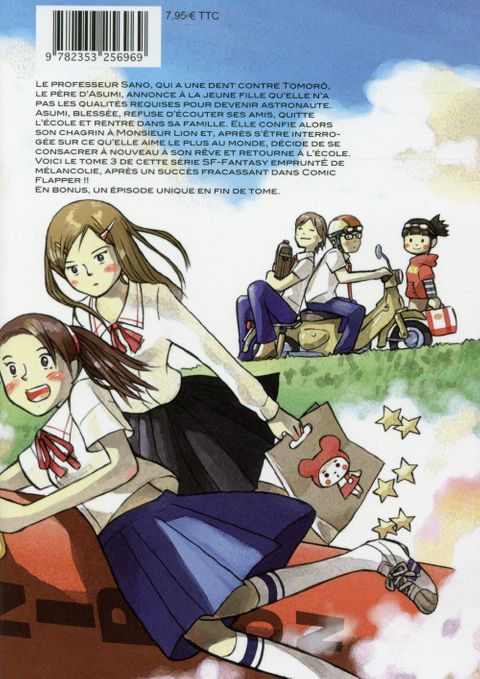 Kou Yaginuma Né en 1973. Il fait ses débuts avec Le Grand Feu d'Artifice de 2015 (publié dans Comic Flapper en juillet 2000), et charme les fans de manga avec son graphisme chaleureux et ses récits émouvants. Vient ensuite Asumi, qui remporte un énorme succès, et la publication en épisodes de Spicax2 dans Comic Flapper à partir du numéro d'octobre 2001. Il est aujourd'hui l'un des mangakas préférés des jeunes lecteurs. Son dernier succès en date est AVERSES TURQUOISE. Le professeur Sano, qui a une dent contre Tomorô, le père d'Asumi, annonce à la jeune fille qu'elle n'a pas les qualités requises pour devenir astronaute. Asumi, blessée, refuse d'écouter ses amis, quitte l'école et rentre dans sa famille. Elle confie alors son chagrin à Monsieur Lion et, après s'être interrogée sur ce qu'elle aime le plus au monde, décide de se consacrer à nouveau à son rêve et retourne à l'école. Voici le tome 3 de cette série SF-Fantasy emprunté de mélancolie, après un succès fracassant dans Comic Flapper !! En bonus, un épisode unique en fin de tome.