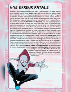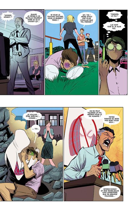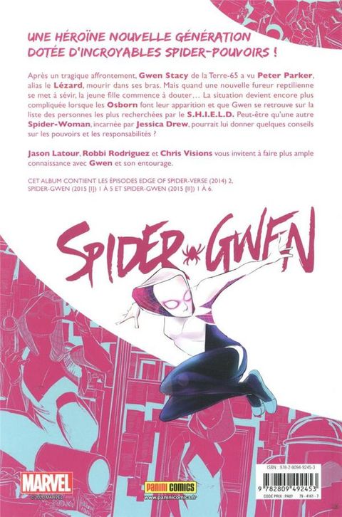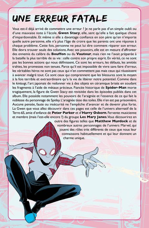Et si l'araignée radioactive avait mordu Gwen Stacy à la place de Peter Parker ? Dans cet univers parallèle, l'adolescente devient la super-héroïne connue sous le nom de Spider-Woman. Après s'être retrouvée au coeur de l'événement Spider-Verse, Gwen poursuit ses aventures et affronte le Vautour, le lieutenant de police Frank Castle et le Bouffon Vert. Les albums Marvel Young Adult sont destinés à un large public et notamment aux adolescents. La série Spider-Gwen plaira particulièrement au public ayant découvert l'univers de Spider-Man à travers le film d'animation oscarisé Spider-Man : New Generation.