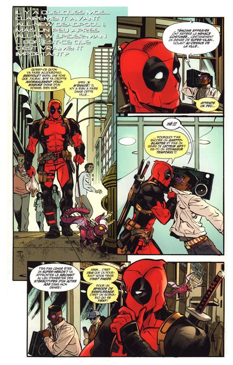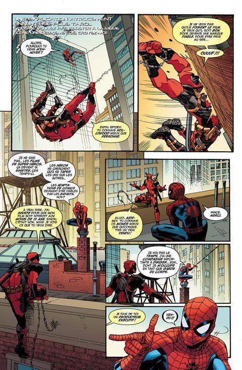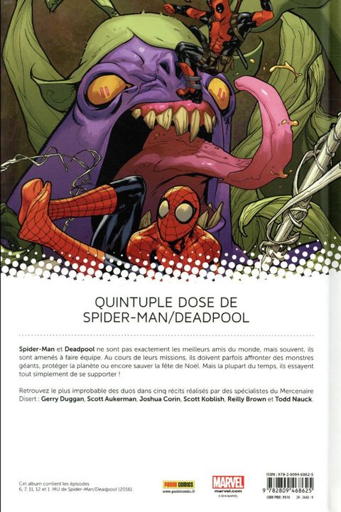 Spider-Man et Deadpool sont deux Avengers. Membres de la même équipe, dotés tous les deux d'un sens aigu de l'humour, ils ont tout pour s'entendre. Mais non ! Retrouvez cinq one-shots où le Tisseur essaie tant bien que mal de supporter le Mercenaire Disert ! (Contient les épisodes US Spider-Man / Deadpool (2016) 6,7, 11, 12 et 1.MU publiés précédemment dans les revues ALL-NEW DEADPOOL 7-8 et LES MONSTRES ATTAQUENT 1)