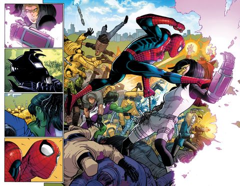 C'est l'heure du combat final entre super-héros et super-mafieux ! Vous n'avez jamais vu un tel affrontement dans les rues de New York ! D'un côté, Spider-Man, Miss Hulk, Spider-Woman et Elektra (dans son costume de Daredevil) ! De l'autre, Madame Masque, le Super-Bouffon, Diamondback et bien d'autres ! Bouquet final pour le crossover de l'été. Les conséquences seront nombreuses, en particulier pour Peter Parker, et elles seront explorées dès le mois prochain lorsque la série Amazing Spider-Man réintègrera les pages de MARVEL COMICS !