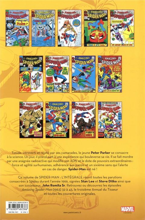 Rejeté par ses camarades qui le trouvent trop introverti, le jeune Peter Parker se consacre tout entier à la science. Au cours d'une expérience, il se fait piquer par une araignée radioactive qui modifie son ADN et le dote de pouvoirs extraordinaires : force et agilité surhumaines, adhérence aux parois, plus un sixième sens qui l'alerte en cas de danger. Spider Man est né ! Le quatrième tome de Spider-Man: l'Intégrale réunit toutes les parutions consacrées à Spidey durant l'année 1966, signées Stan Lee, Steve Ditko et, le successeur de ce dernier John Romita Sr. Retrouvez ou découvrez les épisodes 32 à 43 de la première série Amazing Spider-Man, le troisième annual du Tisseur et, bien sûr, toutes les couvertures originales.