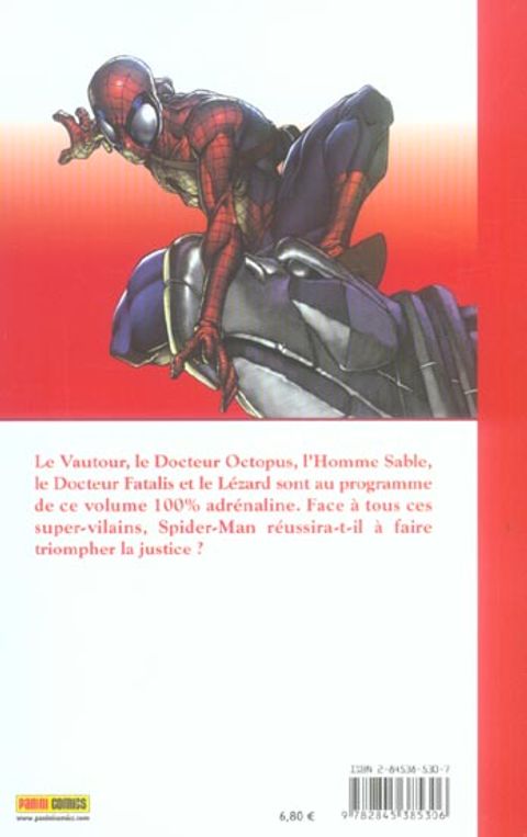 le vautour, le docteur octopus, l'homme sable, le docteur fatalis et le lézard sont au programme de ce volume 100% adrénaline. face à tous ces super vilains, spider-man réussira-t-il à faire triompher la justice oe