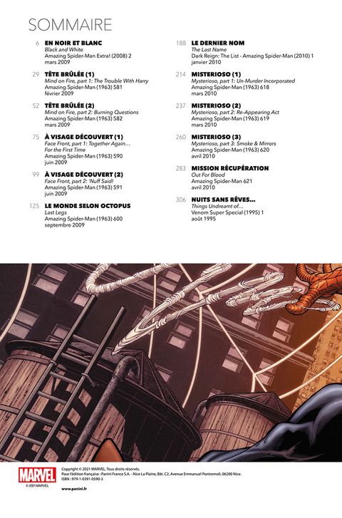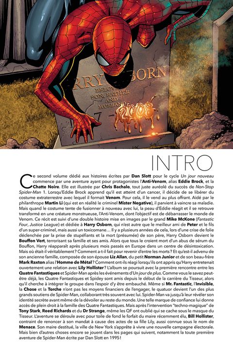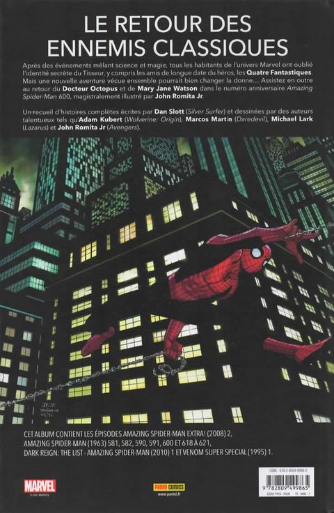 Entre nouvelles menaces et retour d'anciens ennemis, Spider-Man n'a pas le temps de souffler ! L'Anti-Venom et la Chatte Noire sont de retour, et Harry Osborn aussi. Quant aux Quatre Fantastiques, le pacte de Peter avec Méphisto a effacé son identité de leurs esprits. Leurs relations pourront-elles redevenir ce qu'elles étaient ? Quant à la ville de New York, elle s'apprête à élire un nouveau maire. Cet album recueille tous les épisodes de la série Amazing Spider-Man écrits par Dan Slott entre 2009 et 2010, lorsqu'il partageait le poste de scénariste avec d'autres architectes de la Maison des Idées. Vous trouverez également ici la première incursion de Slott dans l'univers de Spidey avec une histoire de Venom datant de 1995.