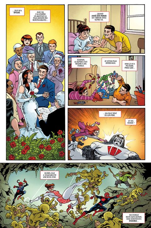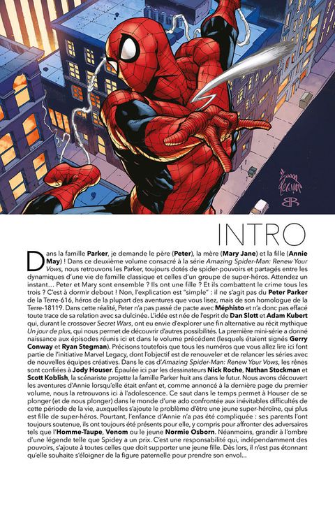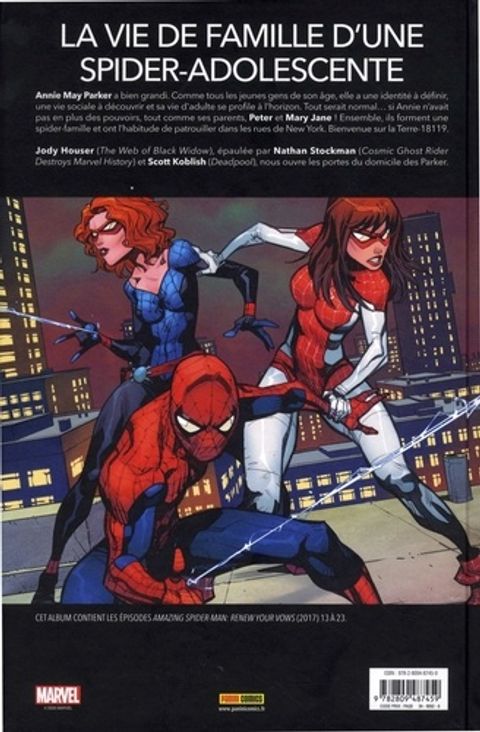 Huit ans ont passé et la famille de Spider-Man continue de protéger New York ! Annie, la fille de Peter et MJ est désormais au lycée, mais dès que les cours sont finis elle rejoint ses parents au bout de leur toile ! Tandis que d'anciens et nouveaux ennemis font leur apparition, Spider-Man doit accepter que sa fille est désormais une super-héroïne indépendante... Si le premier tome proposait des histoires prépubliées dans le mensuel SPIDER-MAN, cet album est en revanche totalement inédit. On a pu retrouver les personnages de cet univers dans le récit SPIDER-GEDDON.