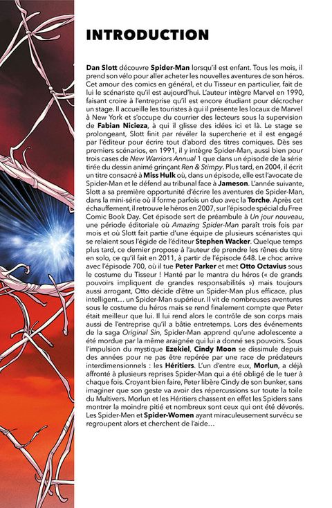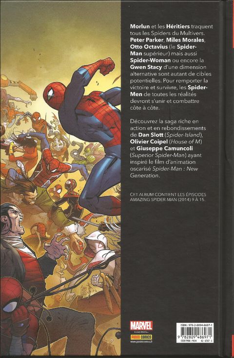 MUST HAVE ! Morlun, un des plus redoutables ennemis de Spider-Man est de retour, et cette fois, il est accompagné de toute sa famille. Ensemble, ils sèment le chaos dans le multivers et se nourrissent de la force vitale des différentes incarnations du Tisseur ! Pour espérer survivre, les araignées doivent s'unir, qu'elles viennent de l'univers Amazing, Ultimate, Superior, 1602, 2099... ou de bien d'autres encore ! Cet album fait partie des must have, des récits essentiels et accessibles destinés à tous les amateurs de super-héros. Identifiés clairement par un logo sur la couverture, les lecteurs repèreront immédiatement ces incontournables pour se constituer leur bibliothèque Marvel idéale. Cette saga signée DanSlott (Fantastic Four), OlivierCoipel (Thor) et GiuseppeCamuncoli (Dark Vador : Le Seigneur Noir des Sith) est instantanément devenue culte. Elle a introduit le personnage de Spider-Gwen, a été adaptée au cinéma pour un film multi-primé et a également une suite avec Spider-Geddon.