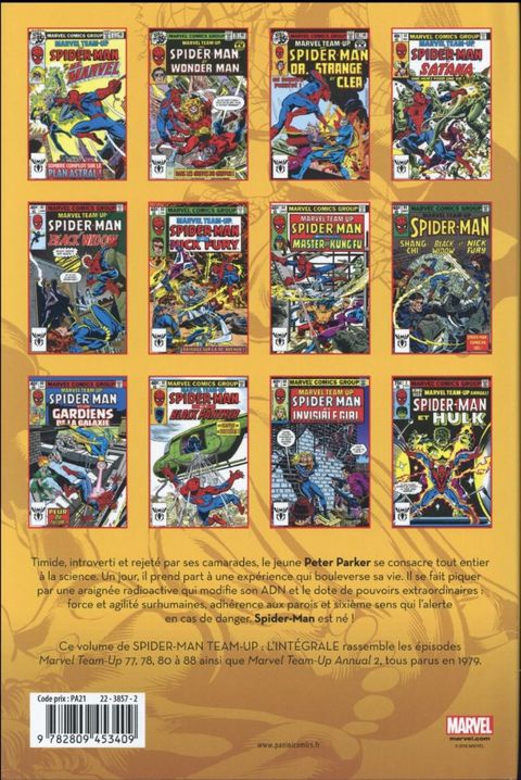 L'intégrale de la série Marvel Team-Up se poursuit avec une douzaine de nouvelles aventures. Spider-Man fait équipe avec un grand nombre de héros dont Miss Marvel, Wonder Man, Docteur Strange, Satana, Black Widow, Nick Fury, les Gardiens de la Galaxie, la Panthère Noire et l'Invisible. Retrouvez aussi un annual avec Hulk en invité.
