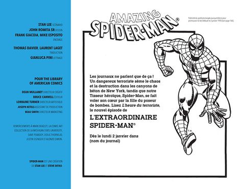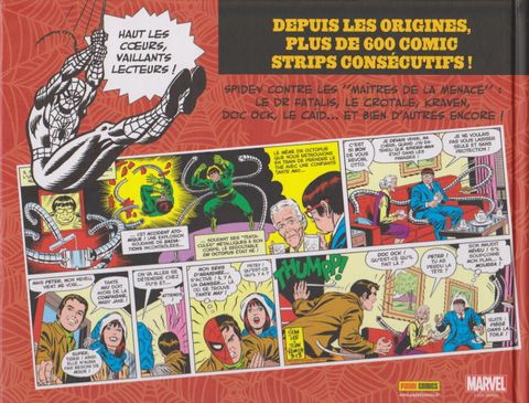 Retrouvez dans cette collection l'intégralité des comic strips de Spider-Man parus dans la presse aux Etats-Unis, y compris les pages en couleurs des épisodes du dimanche. Ce premier tome est consacré aux années 1977 et 1978. La publication des comic strips dans les journaux américains s'est poursuivie jusqu'en 2019. Ils ont été signés par Stan Lee jusqu'au bout (même s'ils étaient en réalité écrits depuis plusieurs années par Roy Thomas, un autre rédacteur en chef de Marvel). Cette collection propose 5 tomes en VO couvrant 1977 à 1986.