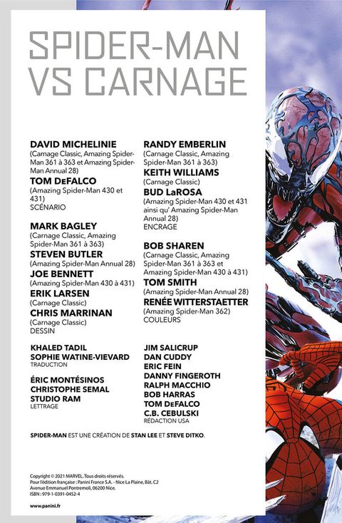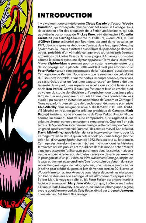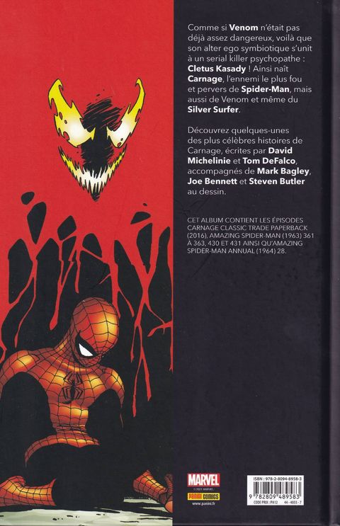 Au programme de cet album : trois rencontres cultes du psychopathe Cletus Kasady, alias Carnage, avec Spider-Man ! Ces affrontements sont signés par les plus grands auteurs du Tisseur comme David Michelinie, Tom DeFalco et Mark Bagley. Tandis que le film Venom 2, mettant en scène Carnage, sort le 25 juin dans les salles obscures, les lecteurs pourront découvrir ce volume one-shot contenant trois récits complets.