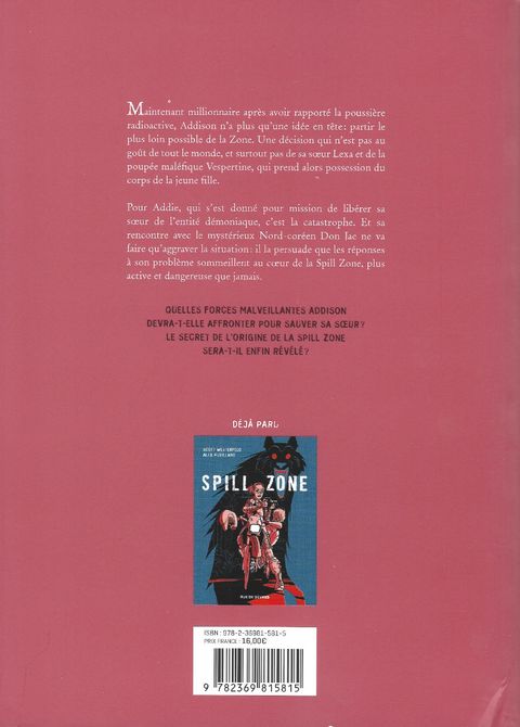 Ll y a trois ans un événement a détruit la petite ville de Poughkeepsie, changeant à jamais la réalité de ses frontières. Désormais d'étranges phénomènes et des dangers mortels guettent tous ceux qui s'aventurent dans cette zone. La dernière fois qu'Addison y est allée, c'était pour récupérer une disquette radio-active en échange d'un million de dollars. Mission accomplie mais au dépens des règles de sécurité qu'elle s'était imposée : ne pas mettre un pied à terre ni toucher quoi que ce soit. Depuis cette incursion, elle n'est plus tout à fait la même. Parallèlement à son aventure, une autre Spill zone radioactive a été répertoriée en Corée du Nord et un certain Don Jae a vécu la même expérience. Lui aussi en est revenu changé et cherche à comprendre les différences et similitudes entre ces deux territoires . Le FBI est à présent sur le coup. Alors qu'Addison décide de quitter la région pour offrir une vie meilleure à sa petite soeur Lexa, Vespertine, l'esprit échappé de la Spill zone qui prenait vie sous les traits d'une poupée de chiffon - prend désormais possession du corps de Lexa. Addison saura-t-elle l'en délivrer ? C'est sans compter sur les liens très particuliers qui lient la jeune fille et l'étrange esprit ...