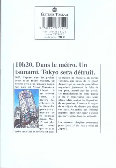 10 h 20. Dans le métro. Un tsunami. Tokyo sera détruit. 2 017. Nageant dans les profondeurs d'un Tokyo englouti, un homme rêve d'un nouveau Japon. Son nom est Misao Munakata. Rêvant à un nouveau futur, il gravira les échelons de la hiérarchie gouvernementale de ce nouveau Japon. Mais 15 ans plus tôt, alors que lui et sa petite amie Eri se trouvaient dans la station de Shibuya, ils furent victimes, eux aussi, de ce grand désastre qui ravagea le pays. Misao organisait justement la fuite de son père, acculé par les dettes. Le tremblement de terre tomba à pic et bouleversa tous leurs plans. Mais malgré la disparition de ses proches, il trouva le moyen de se réjouir du drame que vivait son pays. Au milieu des ténèbres apparut alors une lueur d'espoir que sa vie précédente lui refusait. Un nouveau chapitre commence pour Spirit of the Sun : celui du Japon !