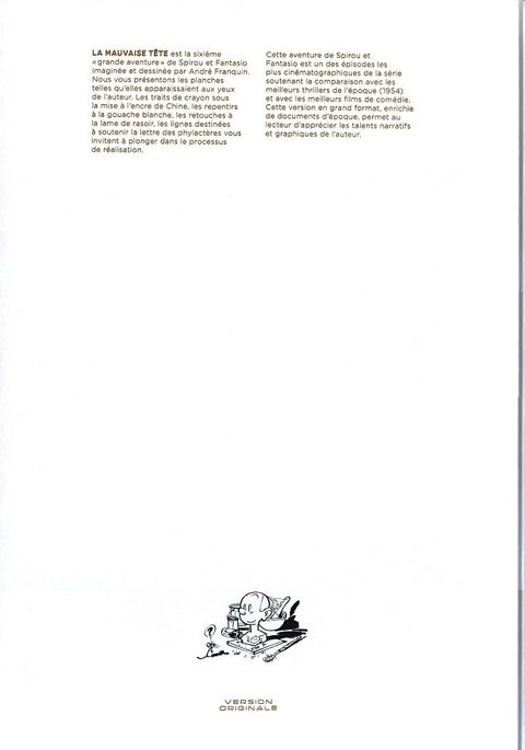 La collection 'Version Originale' présente les planches de Franquin en fac-similés, publiées au format de leur réalisation. Travail à deux mains (les mains droites de Franquin et Jidéhem), on peut ainsi déceler la virtuosité du trait, la construction du trait crayonné, les repentirs grattés à la lame de rasoir ou les traits effacés à coups de gouache. Une manière de s'immerger dans le travail du créateur.