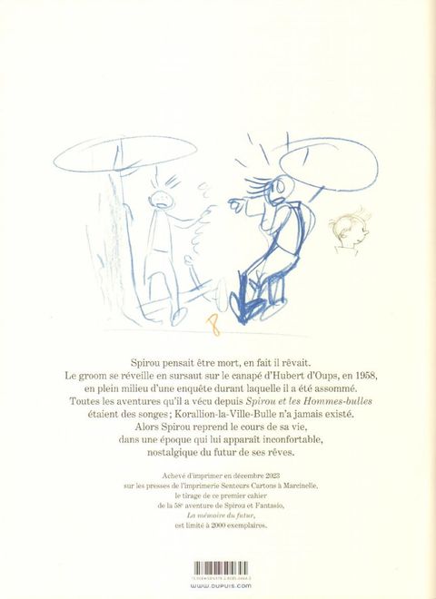 Spirou est mort. Sauf en 1958, l'année de l'Exposition universelle de Bruxelles. Un étrange espace-temps où il pourrait bien mourir à nouveau... Bienvenue dans « La mémoire du futur », le tome 57 de Spirou et Fantasio ! Une étonnante aventure à découvrir en avant-première avec Les Cahier Dupuis, qui vous proposent une présentation immersive alternant en regard pages de crayonnés et pages encrées, ainsi que de nombreuses pièces préparatoires rapportées en direct du quotidien des auteurs !