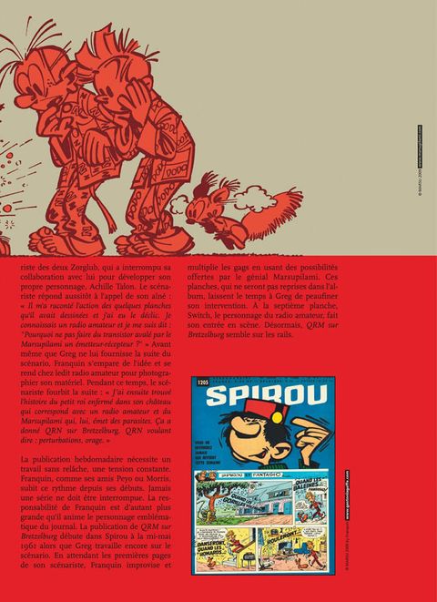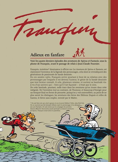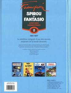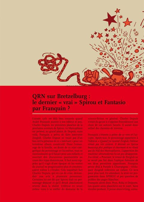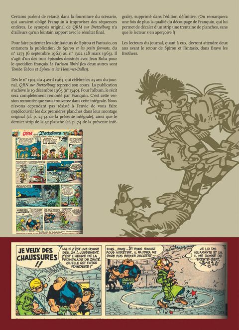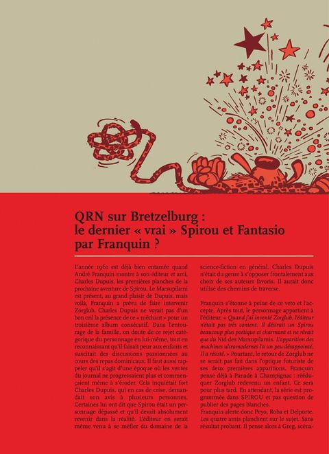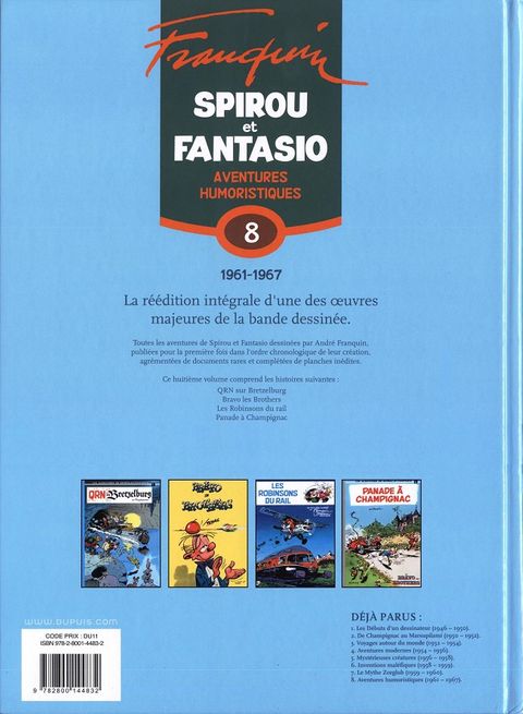 Ce huitième volume comprend les aventures "QRN sur Bretzelburg", "Panade à Champignac", "Bravo les brothers", ainsi que le roman illustré "Les Robinsons du rail". Avec ces albums, les derniers qu'il réalise pour la série "Spirou et Fantasio", Franquin accomplit un exploit paradoxal ; nerveusement épuisé, de surcroît lassé par le personnage de Spirou, il livre néanmoins trois ultimes histoires qui feront date dans la série, tant par leur tension graphique que par leur virtuosité narrative. Les scènes d'anthologie s'y succèdent ; Fantasio face au terrible et sadique Dr Kilikil dans "QRN sur Bretzelburg", ou encore le Comte de Champignac surpris en train de langer un Zorglub retombé en enfance dans "Panade à Champignac". Pour ces derniers récits, "Panade à Champignac" et "Bravo les Brothers", réunis en un album au ton plutôt parodique, Franquin ose se libérer des conventions narratives propres à la série qui l'a fait connaître et dont il s'est détaché pour poursuivre son oeuvre.