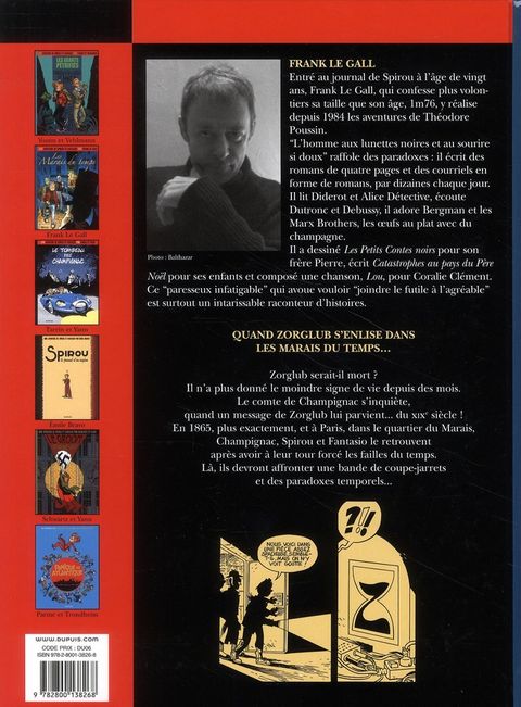 Par une journée d'octobre 2006, le comte de Champignac reçoit un message de Zorglub. Ce dernier a réussi à pénétrer les secrets du temps. Profitant d'une faille temporelle, Zorglub a atterri dans Le Marais, en 1865. S'étant fourvoyé dans ce passé, Zorglub fait appel à Champignac pour le ramener dans le présent. Accompagnés de Spirou, Fantasio et Spip, ce bon vieux comte va tout mettre en oeuvre pour y parvenir... Frank Le Gall nous entraîne dans le Paris du dix-neuvième, et plus précisément dans le quartier du Marais. Une belle aventure pour nos héros qui devront se familiariser à l'argot !