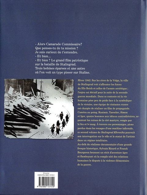 Stalingrad, hiver 1942. L'équipe de tournage envoyée à Stalingrad, au coeur de la bataille qui y fait alors rage, pour fi lmer la grandeur de l'armée soviétique, accumule les catastrophes : non seulement Simon et Yaroslav se haïssent, mais une des précieuses bobines du fi lm a disparu. Or Kazimir, censé superviser ce calamiteux tournage, ne peut absolument pas se permettre la perte d'une bobine. Comble de malchance, il se fait tirer dessus, tandis que le reste de l'équipe tombe aux mains de soldats soviétiques persuadés d'avoir affaire à des déserteurs. S'il est vital pour Kazimir de récupérer la fameuse bobine, dérobée par Yaroslav le cinéaste, il est tout autant primordial pour Simon de l'intercepter. Le bout de fi lm qu'elle contient pourrait en effet condamner à mort l'ancien directeur du centre cinématographique tombé dans la disgrâce. Bourgeron et Ricard signent là un récit atypique, qui met en scène des hommes pris dans la tourmente d'une guerre sans merci et d'un régime sans pitié, obligés de mener à bien un projet absurde. À travers les personnages de Simon et de Yaroslav, pions perdus dans les rouages d'une machine infernale, Stalingrad Khronika interroge le rôle et le statut de l'art et de l'artiste dans un régime totalitaire.