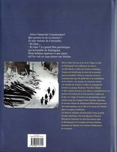 Stalingrad, hiver 1942. L'équipe de tournage envoyée à Stalingrad, au coeur de la bataille qui y fait alors rage, pour fi lmer la grandeur de l'armée soviétique, accumule les catastrophes : non seulement Simon et Yaroslav se haïssent, mais une des précieuses bobines du fi lm a disparu. Or Kazimir, censé superviser ce calamiteux tournage, ne peut absolument pas se permettre la perte d'une bobine. Comble de malchance, il se fait tirer dessus, tandis que le reste de l'équipe tombe aux mains de soldats soviétiques persuadés d'avoir affaire à des déserteurs. S'il est vital pour Kazimir de récupérer la fameuse bobine, dérobée par Yaroslav le cinéaste, il est tout autant primordial pour Simon de l'intercepter. Le bout de fi lm qu'elle contient pourrait en effet condamner à mort l'ancien directeur du centre cinématographique tombé dans la disgrâce. Bourgeron et Ricard signent là un récit atypique, qui met en scène des hommes pris dans la tourmente d'une guerre sans merci et d'un régime sans pitié, obligés de mener à bien un projet absurde. À travers les personnages de Simon et de Yaroslav, pions perdus dans les rouages d'une machine infernale, Stalingrad Khronika interroge le rôle et le statut de l'art et de l'artiste dans un régime totalitaire.