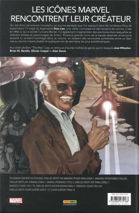 Déjà un an que Stan Lee nous a quittés. Pour lui rendre hommage voici un album exceptionnel réunissant plusieurs rencontres du scénariste avec ses créations. Des épisodes en grande partie inédits. Le saviez-vous ? Stan Lee a rencontré Spider-Man, la Chose, Fatalis, les Quatre Fantastiques et le Docteur Strange. Retrouvez ces récits imaginés par le plus célèbre scénariste de comics, ainsi que des hommages signés Joss Whedon, Brian M. Bendis, Roy Thomas et Jeph Loeb.