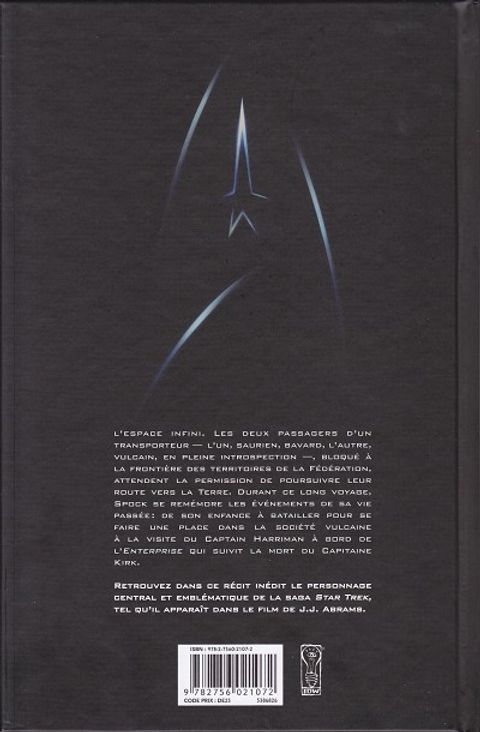 L'espace infini. Deux passagers d'un transporteur, bloqués à la frontière des territoires de la Fédération, attendent la permission de poursuivre leur route vers la Terre. Durant ce voyage, Spock se remémore sa vie passée : de son enfance à batailler pour se faire une place dans la société vulcaine, jusqu'à la visite du Capitaine Harriman à bord de l'Enterprise peu après la mort du Capitaine Kirk.