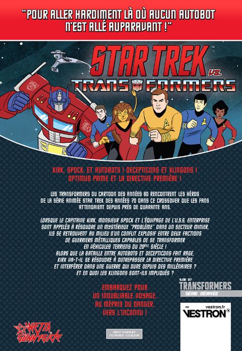 Les personnages de la série animée STAR TREK des années 70 rencontrent ceux du cartoon TRANSFORMERS des années 80 ! Un crossover reprenant fidèlement les designs et l'esprit de ces deux oeuvres télévisées qui ont marqué leurs époques, pour les amener vers un futur complètement fou où l'USS Enterprise se révèle être un Autobot ! Retrouvez Optimus Prime, le Capitaine Kirk, Monsieur Spock, Bumblebee, Megatron, les Klingons et tous les autres dans ce comic book incroyable, au mépris du danger et en avançant vers l'inconnu !