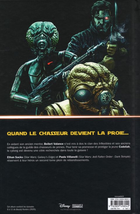 La tête de Valance est mise à prix alors qu'il transporte avec lui une cargaison précieuse, ce qui le force à aller trouver la seule personne dans toute la galaxie en qui il peut avoir confiance. Mais voici que deux chasseurs de prime particulièrement redoutables sont à ses trousses. Vous allez faire la connaissance de 4-Lom et Zuckuss. Valance va devoir prendre une terrible décision... Deuxième tome pour cette saga originale se déroulant dans l'univers de Star Wars. Comme son nom l'indique, elle s'intéresse de près aux chasseurs de prime qui ont fait le succès de la série Disney+ The Mandalorian !