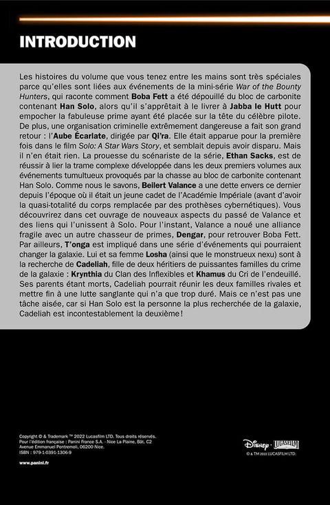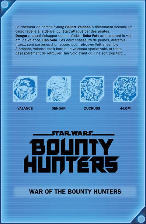 Valance et Dengar, son partenaire malgré lui, tentent d'intercepter Boba Fett et le corps de Han Solo qu'il transporte... mais qui les poursuit, eux ? Et qui est le mystérieux chef de la bande d'assassins à leurs trousses ? Avec la participation de Chewbacca ! Nous poursuivons la réédition série par série des épisodes concernés par le crossover War of the Bounty Hunters. Celles et ceux qui préfèrent suivre indépendamment les différentes séries y trouveront ainsi leur compte, car l'événement a été conçu pour satisfaire tous les types de lecteurs !